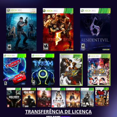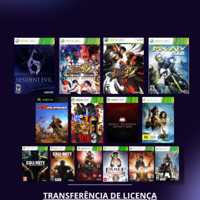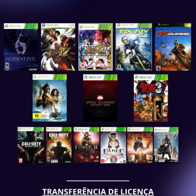 Residend Evil 6 + Street Fighter 4 Super + Street Fighter 4 + Mx vs Atv Alive + Mx Unleashed + Space Invader + Metal Slug 3 + Port Royale 3 + Call of Duty Black ops 1 e 3 + Trilogia Fable – XBOX 360 – Midia Digital TRANSFERÊNCIA DE LICENÇA