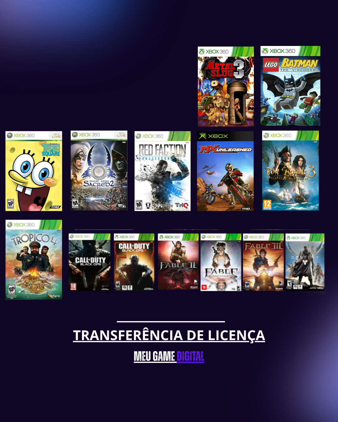 Bob Esponja + Sacred 2 + Lego Batman 1 + Red Faction Armagedon + Metal Slug 3 + Tropico 4 + Mx Unleashed + Port Royale 3+ Call of Duty Black ops 1 e 3 + Fable – XBOX 360 – Midia Digital TRANSFERÊNCIA DE LICENÇA