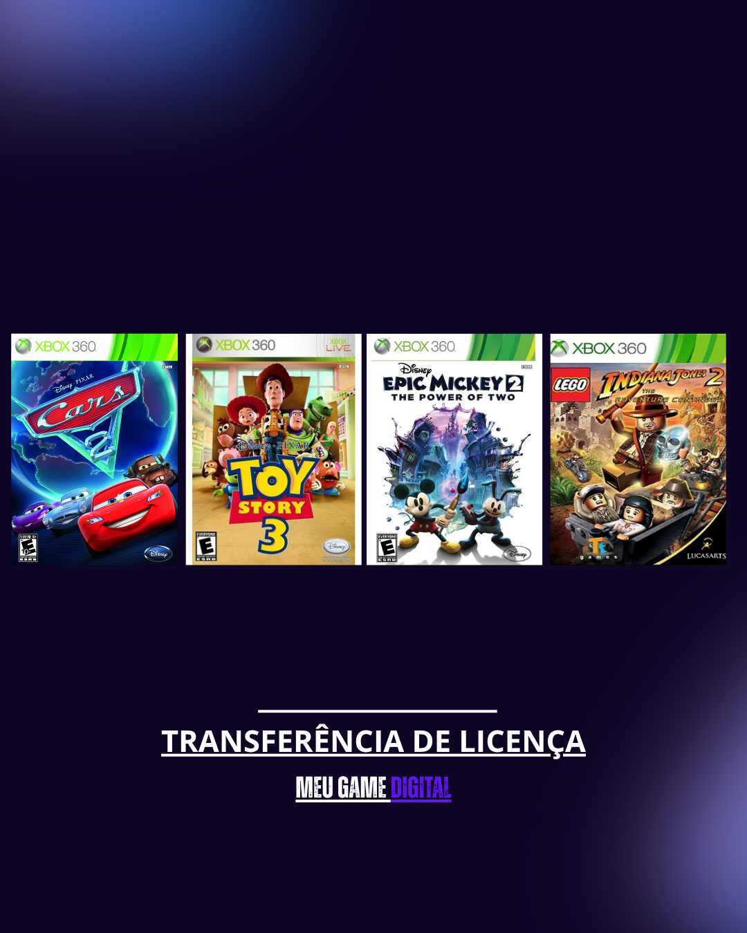 Carros 2 + Toy Story 3 + Mickey 2 + Lego Indiana Jones 2 – XBOX 360 – Midia Digital TRANSFERÊNCIA DE LICENÇA