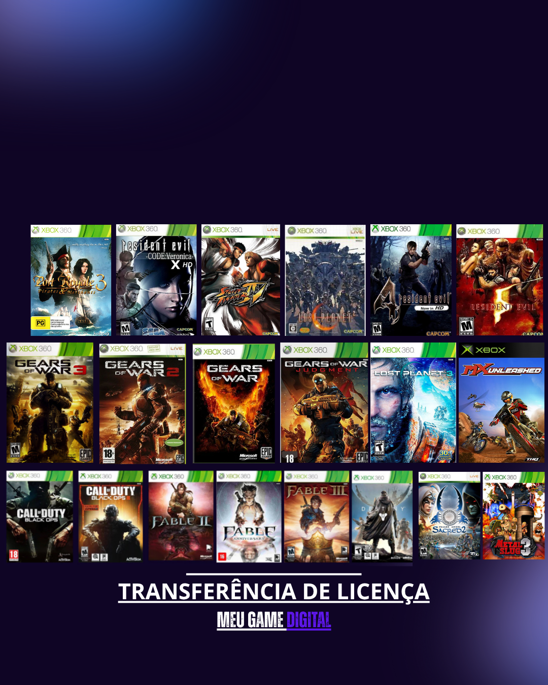 Coleção Gears of War + Resident Evil 4 e 5 + Lost Planet 3 e 2 + Street Fighter 4 + Resident Evil Code Veronica + Call of Duty Black ops 1 e 3 + Sacred 2 + Metal Slug 3 + Port Royale 3 + Mx Unleashed – XBOX 360 – Midia Digital TRANSFERÊNCIA DE LICENÇA